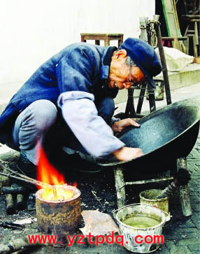 補(bǔ)鍋匠左手拉著風(fēng)箱,右手提過(guò)鍋,放在鋪有草木灰的地上,m.aixiangbo.com用一只小巧玲瓏的鐵錘,在要補(bǔ)的四周輕輕地敲打。