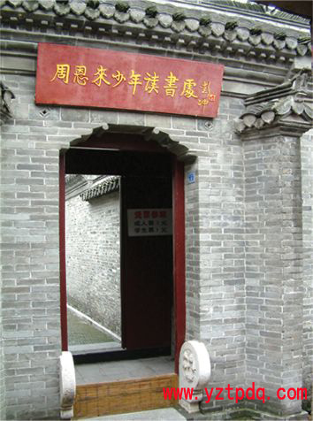 周恩來少年讀書處位于揚州市寶應(yīng)縣城水巷口3號,原為周恩來外祖父陳沅的宅第。整個建筑為明清風格,占地700平方米,建筑面積500平方米,共有房屋十八間。讀書處人門朝北,門樓古樸莊重,門楣上方是原全國人大常委會副委員長彭沖親筆題寫的“
