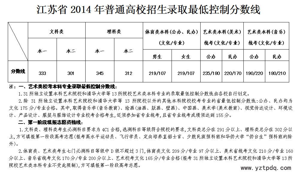 2014年6月24日下午,江蘇省高校招生委員會(huì)召開(kāi)會(huì)議,審議通過(guò)了2014年江蘇省普通高校招生第一階段錄取各批次省最低控制分?jǐn)?shù)線。其中,文科:一本333、二本301;理科:一本345、二本312;藝術(shù)(文化/專(zhuān)業(yè))公本235/180、民本220/170; 體育(文/專(zhuān))男219/107、女219/107。